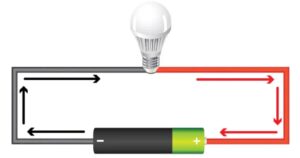 Pada rangkaian DC ini saklar dalam keadaan tertutup (ON). Tegangan pada sumber listrik—”perbedaan potensial” antara kedua kutub baterai—diaktifkan, menciptakan tekanan yang memaksa elektron mengalir sebagai arus keluar dari terminal negatif baterai. Arus mencapai cahaya, menyebabkannya bersinar. Arus kembali ke sumber listrik.